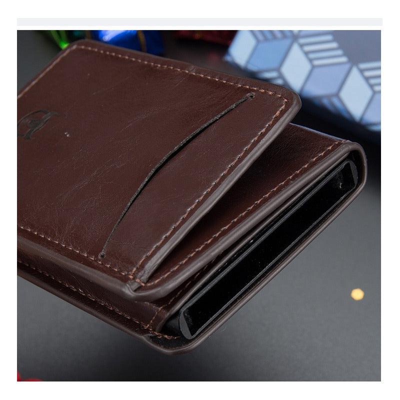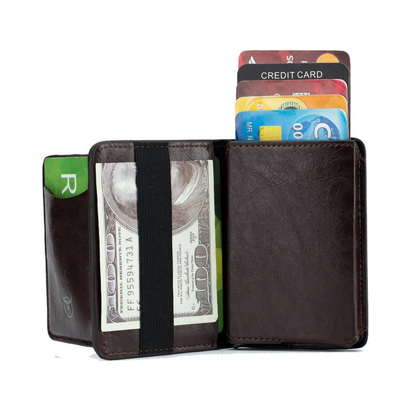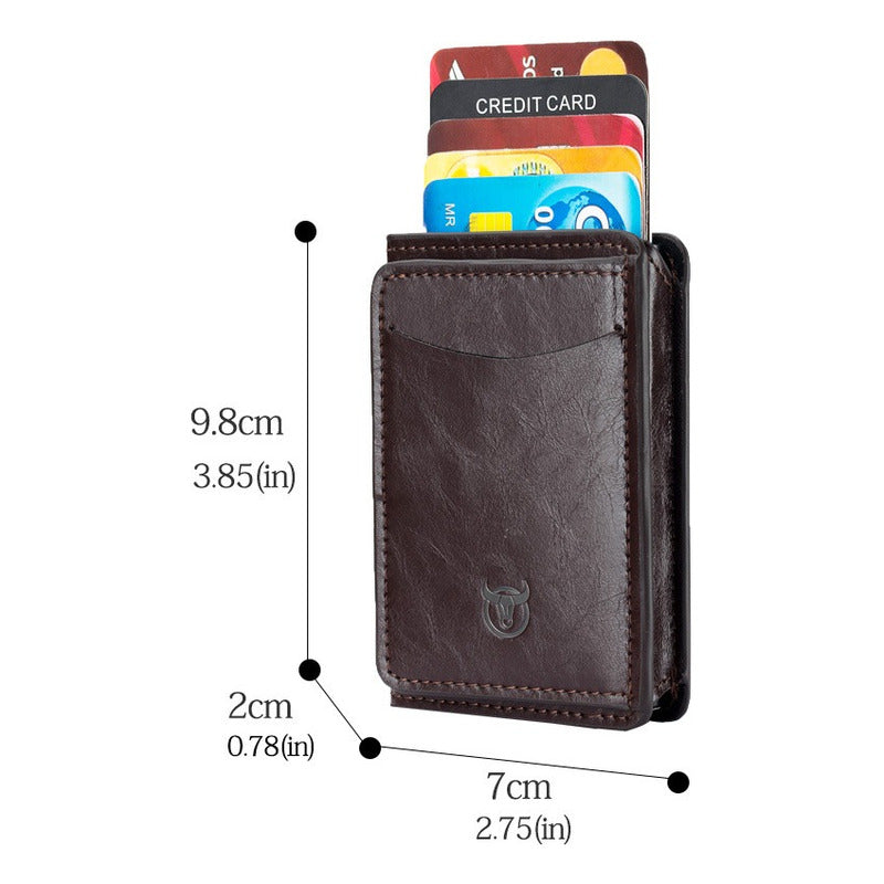 Tarjetero billetera cuero Bull Captain protec RFID mod Bully Tarjetero billetera de hombre de la marca Bull Captain que, junto con sus materiales de cuero genuino, sus telas y cremalleras, además de los procesos de fabricación, hacen de él un producto de calidad, resaltando así un estilo propio y elegante a la vez. Especificaciones Marca: Bull Captain Material exterior: Cuero de vaca genuino Material interior: Poliéster Dimensiones: 9.8 cm x 7 cm x 2 cm Incluye bloqueo RFID Compartimentos: 5 ranuras para tarjetas desplegables, 4 ranuras para tarjetas internas, compartimentos internos múltiples usos Tipo de cierre: Magnético Estilo: Casual – Elegante **INCLUYE CAJA DE PRESENTACIÓN** **Envíos a todo Chile** ***SI POSEE ALGUNA DUDA O CONSULTA, NO DUDE EN ESCRIBIRNOS, SU SOLICITUD SERA ATENDIDA A LA BREVEDAD***