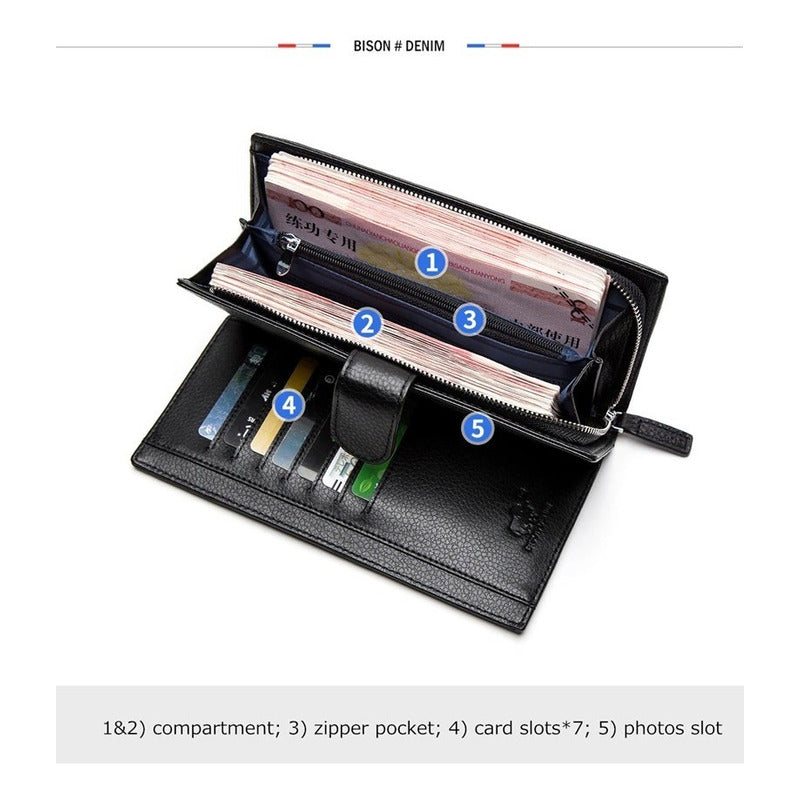 Chequera gruesa de cuero genuino lujo Bison Denim mod. Gross La calidad y autenticidad de la materia prima de los productos Bison Denim hacen que sea un regalo de primera calidad, ofreciendo una elegancia y una durabilidad incomparable. Dada su fabricación con materiales genuinos, hace de ella un producto fiel y confiable, que combina la sencillez y la formalidad. Especificaciones Marca: Bison Denim Material exterior: Cuero genuino Material interior: Poliéster Dimensiones: 19.3 cm x 9.8 cm x 3 cm Compartimentos: múltiples ranuras para tarjetas, ranuras para billetes y/o cheques, monedero con cremallera, porta fotos, compartimentos internos múltiples usos Tipo de cierre: Broche a presión - Cremallera Estilo: Moda de lujo **Envíos a todo Chile** ***SI POSEE ALGUNA DUDA O CONSULTA, NO DUDE EN ESCRIBIRNOS, SU SOLICITUD SERA ATENDIDA A LA BREVEDAD***